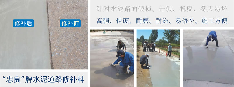 “忠良”牌水泥道路修补料,是针对水泥路面破损、开裂、脱皮、冬天易坏,用水泥砂浆修补麻烦,硬化慢、强度低、易破损,而研发出的一种高强、快硬、耐磨、耐冻、易修补、施工方便的修补材料。