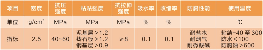 性质:该胶泥为水硬性材料,与水泥基层、陶瓷类耐磨工业板材具有良好的粘结强度,防水抗渗好,耐烟气的腐蚀。